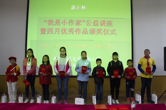 5月5日下午,由兰州市委宣传部、兰州市文明办、兰州日报社、兰州市教育局、兰州市文联联合主办,兰州晚报承办的首届惠正杯“我是小作家”公益讲堂暨兰州市中小学生作文大赛第四期月赛优胜奖颁奖仪式在我校附属小学举行。