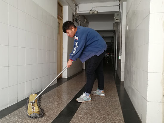 历史文化学院学生马艳艳是参与每周一天,一天两次不到1小时的楼道保洁体验劳动的一名“四自”引导员,在小学和中学就经常参加值日的她,对于这样的劳动她轻而易举。