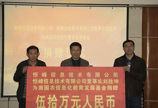 恒峰信息技术有限公司董事长刘胜坤代表公司和他本人,向南国农信息化教育发展基金捐赠了50万元人民币,以表达对信息化教育事业发展的支持和对南国农先生崇高的敬意。他指出,高校和科研院所能够助力企业发展,并在其中起到关键性作用,校企合作为企业提供了一个良好的平台,符合社会潮流和企业需求,双方能够互惠互利。