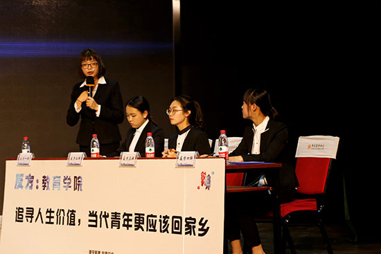马克思主义学院本科生代表队、教育学院本科生代表队和马克思主义学院研究生代表队、商学院研究生代表队分别围绕“追求人生价值,当代青年更应该去远方还是回家乡”为辩题展开对决。经过开篇陈词、一对一攻辩、攻辩小结、自由辩论、观众提问和总结陈词六个环节的唇枪舌剑,最终,教育学院本科生代表队和马克思主义学院研究生代表队分别摘得冠军。马克思主义学院本科生代表队和商学院研究生组代表队分获亚军,地理与环境科学学院本科生代表队、计算机科学与工程学院本科生代表队和心理学院研究生代表队、旅游学院研究生代表队分获季军。心理学院、传媒学院、马克思主义学院、经济学院、计算机科学与工程学院、地理与环境科学学院、法学院获得优秀组织单位称号。马克思主义学院俞泉林等32名同学获最佳辩手。