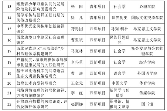 获准项目各学院分布情况为:文学院3项,历史文化学院1项,教育学院1项,心理学院2项,马克思主义学院2项,社会发展与公共管理学院3项,经济学院2项,外国语学院1项,体育学院2项,传媒学院1项,旅游学院1项,国际文化交流学院2项,图书馆1项。