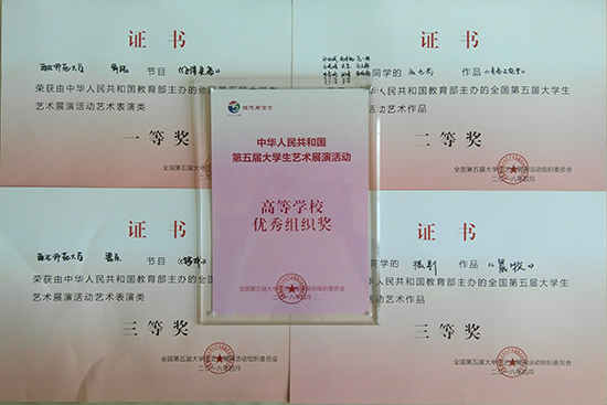 其中,舞蹈学院选送的舞蹈节目《飞得更高》获艺术表演类一等奖、音乐学院选送的器乐节目《锣戏》获三等奖;团委选送的微电影《青春正能量》荣获艺术作品类二等奖、传媒学院选送的摄影作品《晨牧》荣获艺术作品类三等奖。学校荣获高等学校优秀组织奖,相关获奖艺术作品被中华儿女美术馆收藏。