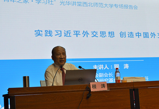 6月29日,由团中央基层组织建设部、中国光华科技基金会联合开展的“青年之家·学习社”光华讲堂西北师大专场报告会举行。中国亚非学会副会长、中国国际问题研究基金会非洲中心主任、高级研究员程涛为师生作了题为《实践习近平外交思想 创造中国外交辉煌》的专题演讲。西北师大副校长张生勇致辞并主持报告会。