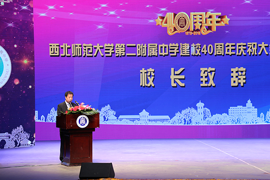 西北师大二附中校长窦继红在讲话中介绍了学校历史沿革以及发展状况。他说,西北师大二附中创建于1978年,我国著名教育家、原西北师范学院院长李秉德先生担任首任校长。四十年来,二附中充分利用地处大学校园育人优势,秉承“严、勤、实、恒”的校训精神,以“引领甘肃基础教育发展、西部一流、全国有一定影响的精品学校”为办学目标,办学成绩显著。四十年岁月峥嵘,几代人躬耕树蕙。校庆是二附中办学品质的精彩展示,是二附中人对历史的尊重和对未来的庄严承诺。所有二附中人将在庆祝活动中收获成长的喜悦和精神的动力,前进路上一定披荆斩棘,再创佳绩。