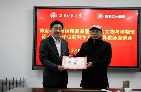 张俊宗向钟爱亭颁发了荣誉证书和文物与博物馆硕士专业学位研究生实践指导教师聘书,对钟先生的无私捐赠行为表示诚挚感谢。