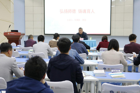 马克思主义学院何继龄教授作了题为《弘扬师德·铸魂育人》的报告。报告紧密围绕习近平总书记有关师德师风建设方面的重要讲话精神,结合自己的职业生涯体会,就师德建设的重要性、新时代师德内涵、如何推进师德建设做了生动详实的阐述。最后,何继龄教授以“以德立身、以德立学、以德施教”与全体教师共勉,希望大家在教书育人的过程中,坚定理想信念,做政治合格的人民教师,坚持教书和育人相统一,坚持潜心问道和关注社会相统一,注重言传身教,真正做学生成长的指路明灯。