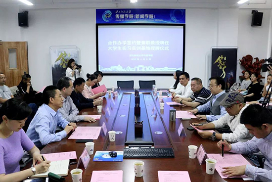 西北师大传媒学院与甘肃广电总台文化影视频道等5家媒体机构签署合作办学协议,聘任甘肃省电影家协会主席石斌等6人为兼职教授及兼职校外导师,为兰州广播电视台等5家媒体机构授牌大学生实习实训基地。
