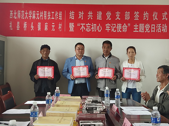 6月29日,西北师大麻元村帮扶工作组在礼县桥头镇麻元村党员活动室举行结对共建党支部签约仪式暨“不忘初心,牢记使命”主题党日活动。西北师大礼县桥头镇麻元村帮扶工作组部分责任单位负责人、党员代表,桥头镇相关负责人,麻元村党支部成员、党员代表,西北师大麻元村帮扶工作队成员参加了活动。