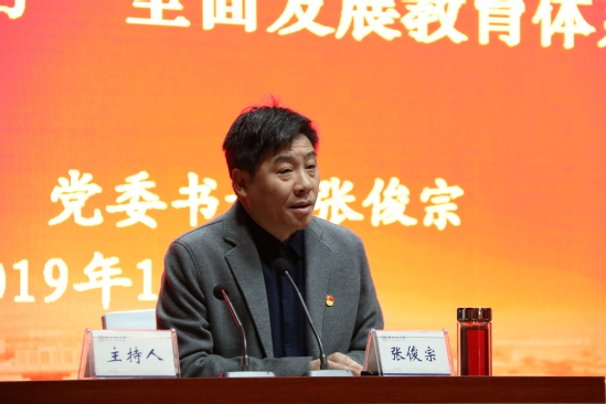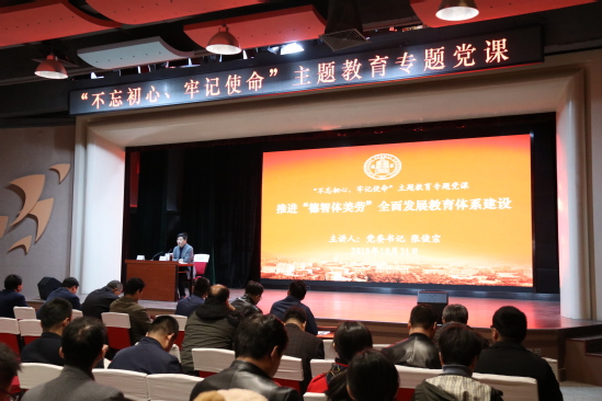 10月31日下,党委书记、学校党委主题教育小组组长张俊宗以《推进“德智体美劳”全面发展教育体系建设》为题,为全校机关各部门主要负责人、各基层党委(党总支)书记、各学院党委(党总支)副书记、专职辅导员和师生党员代表讲授专题党课。