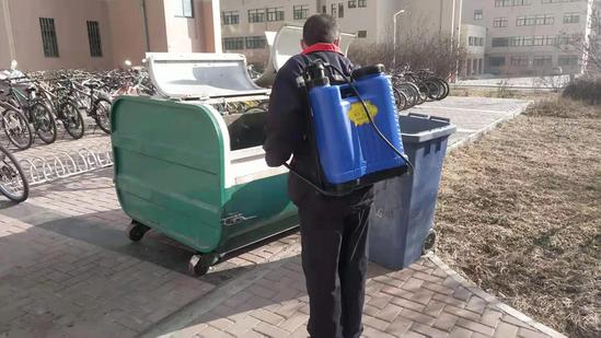 数九寒天,疫情肆虐。西北师大的校园里,20多位工作人员身背消毒器,时不时对 “口罩桶”进行消毒处理,这是学校设立的20多个“专用”垃圾桶,用来收集一次性废弃口罩。
