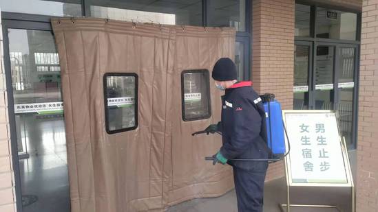 “我们储备了500公斤过氧乙酸消毒液,采购了70个红外测温仪、1500个医用口罩。特殊时期,我们必须全方位提高学校的卫生清洁等级。”学校后勤保障部部长贾志斌说,“对留校学生进行每天早晚两次体温测量,了解学生健康状况。同时,每天对新校区餐厅及时消毒,尤其对餐具实行最严格的消毒,并对出入餐厅的学生进行体温测量和登记,充分保障好留校学生的健康安全。”