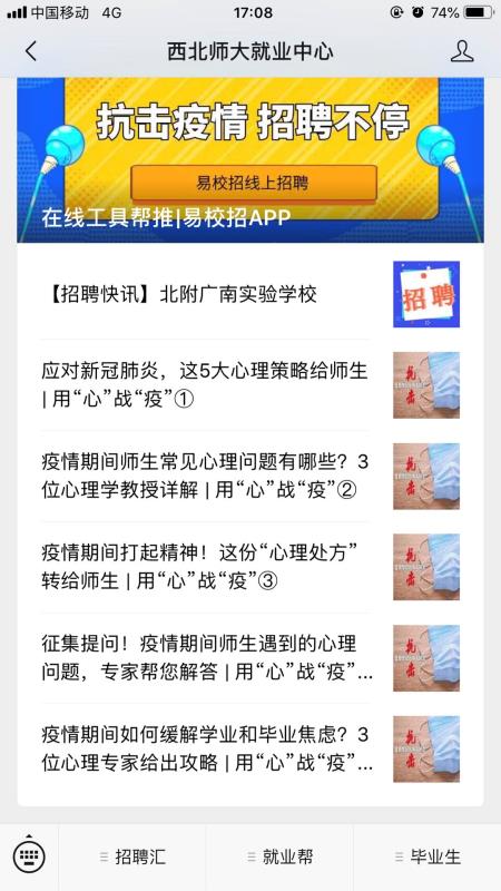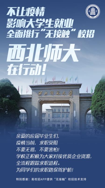 为深入贯彻落实党中央、国务院和省委、省政府和教育厅关于疫情防控期间做好高校毕业生就业和招考工作的要求,西北师大积极应对、科学谋划、主动作为,制定了疫情防控期间就业、招考工作方案,多维度、积极主动开展工作。通过智慧就业平台线上密集推送就业信息,多层次开展线上专场招聘活动,“无接触”为毕业生提供在线就业训练营和生涯教育,确保2020届毕业生高质量、充分就业。