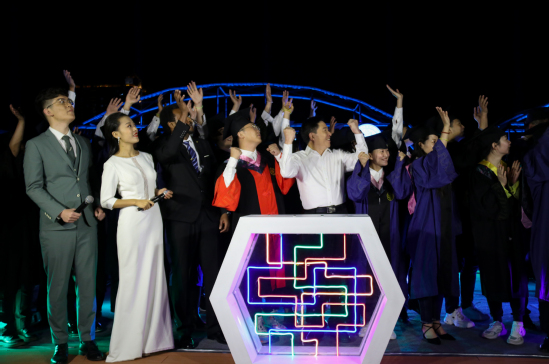 在主会场与分会场同步演唱歌曲《我的祖国》中,“追梦号”游轮在两岸灯火的映照下返航,2020届毕业生特别节目落下帷幕。