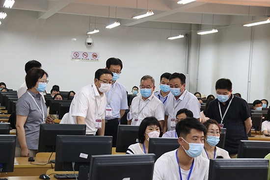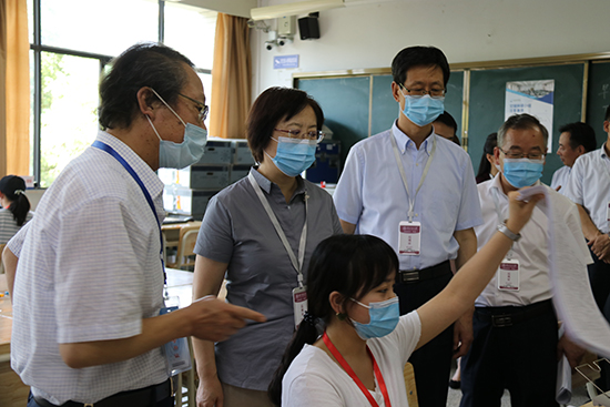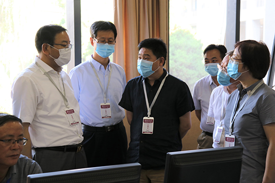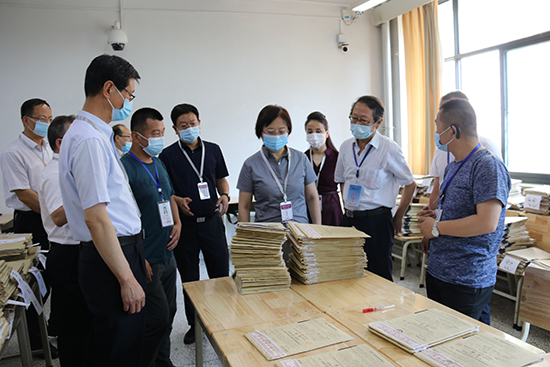 在评卷现场,张世珍实地视察并详细了解了评卷场所的安全保卫、后勤保障、疫情防控及试卷评阅流程、质量监控、工作进展等情况,对我校在疫情期间周密、严谨地组织评卷工作给予充分肯定,向辛勤工作的评卷工作人员表示问候和感谢!