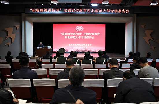 西北师大党委书记张俊宗、副书记刘玉泉、副校长李朝东会见南梁精神宣讲团成员,副校长田澍、董晨钟、张生勇、李建民出席报告会,党委常委、纪委书记、监察专员马庆主持报告会。会上,兰州文理学院马克思主义学院党总支书记马陇平教授、南梁纪念馆陈列展览科科长王雅丽分别作了专题报告。校党委委员、纪委委员、各基层党委(党总支)书记,机关相关职能部门负责人及学生代表260余人聆听报告会。