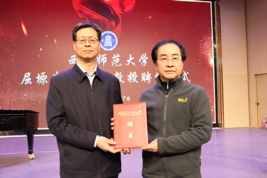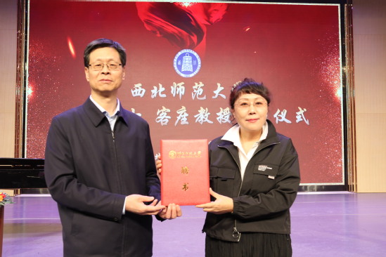 317日下午,西北师大张千一、屈塬、王威教授聘任仪式在音乐厅举行。校长刘仲奎为三位教授颁发了客座教授聘书,学校相关部门负责人和音乐学院师生参加聘任仪式。仪式由副校长邓小娟主持。