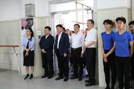 指导组一行在美育中心观看舞蹈学院“百年征程”红色文艺展演作品《黄河》排练现场。
