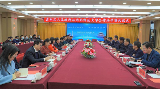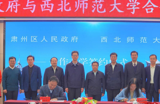 1月5日下午,西北师大与酒泉市肃州区举行合作办学签约仪式。西北师大校长刘仲奎、西北师大党委常委、副校长李朝东和学校相关部门、学院及附属中学负责人参加会议。酒泉市委常委、肃州区委书记何正军,区长王永宏,区人大常委会主任张生铭,区委宣传部部长马慧君,区人大常委会副主任王设仁,区政府副区长郭秀荣及市区相关部门和学校负责人参加合作办学签约仪式。