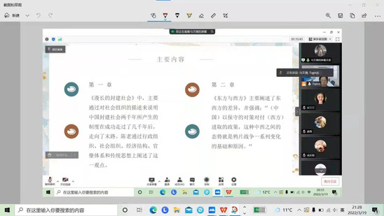 历史文化学院师生们通过线上方式开展读书会、论文指导、政策宣讲等活动,丰富了同学们的课余生活。3月19日,2020级历史学3班在腾讯会议举行《近代中国社会的新陈代谢》分享会。任兰兰分享了近代中国的时间划分和对新陈代谢规律的认识;张国荣讲述了作者对历史唯物主义的具体运用;唐茜认为推动民族冲突与阶级对抗的具体表现就是推翻封建主义;次仁德吉着重对历史人物心态、心理进行了分析;马文倩从中国同西方交流方式变化的角度,客观地理解中国近代发生的急剧变化。读书会、分享会使学生们了解了经典的、前沿的学科知识,培养了他们良好的阅读习惯。