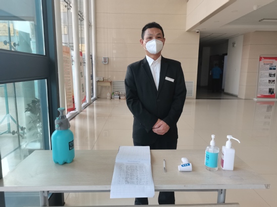 特教楼楼宇值班员梁义军说:“我们的工作分为三个方面:一是楼门监管,无关人员禁止进入,有学生复试、面试先与负责老师核实信息,学生进入楼宇时登记信息、测量体温、手部消毒,使用教室后消杀处理待其他学生使用。二是环境消杀,针对电梯、卫生间、开水器等公用设施,一天三次消杀。学生面试教室随时清扫并消杀,为学生提供最安全的面试场所。三是开关楼门,每天早晚定点开关,睡前巡查排除水电暖和消防安全隐患。”特教楼目前有2位值班人员,吃住皆在楼内,他们严格自律、不怕辛劳,积极为校园防疫贡献一份力量。