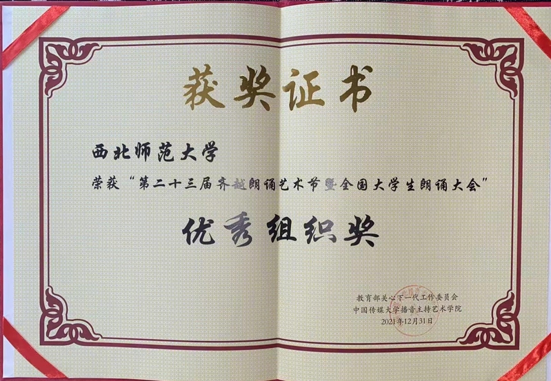 近日,在中国传媒大学主办的第23届齐越朗诵艺术节暨全国大学生朗诵大会上,西北师大传媒学院学生兰琛、朱鸣瑞和美术学院学生曹永强朗诵的《清澈的爱,只为中国》获青年风采特别奖,传媒学院教师马成鸣获优秀指导教师奖,日韩人妻无码一区二区三区久久99_日韩精品一区二区三区中文在线_无码日韩精品一区二区免费_久久久91精品国产一区二区三区_亚洲精品久久久一区黄无码_国产91精品一区二区麻豆网站_成人国内精品久久久久影院获优秀组织单位奖。