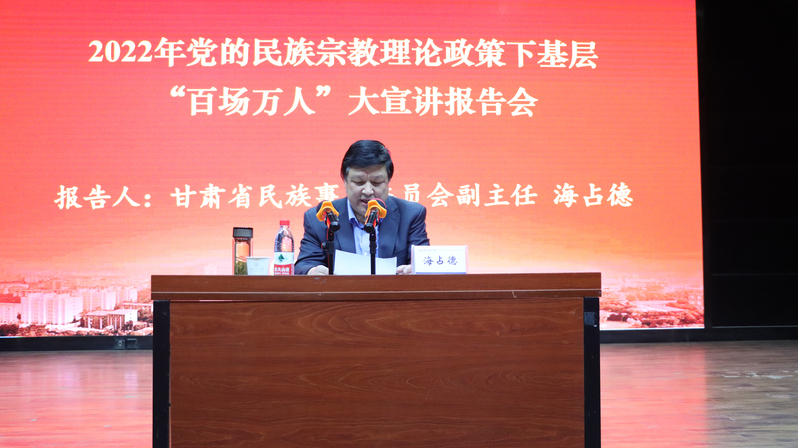 5月17日下午,甘肃省2022年民族宗教理论政策下基层“百场万人”大宣讲第四宣讲组来西北师大开展宣讲活动,甘肃省民委党组成员、副主任、宣讲组组长海占德作专题宣讲。西北师大党委常委、党委统战部部长、副校长韩高年主持宣讲会,机关各部门负责人,各基层党委(党总支)书记、副书记,各学院辅导员、班主任及学生代表200余人参加宣讲会。