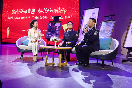 窦勇烈士之子窦永杰警官、李钢烈士之子李俊杰警官分别追忆父亲的英雄事迹;“全国优秀人民警察”、兰州市公安局城关分局刑事侦查直属大队大队长张子剑,“全国公安机关爱民模范集体”代表、兰州市公安局刑警支队电信网络案件侦查大队民警陈荟文分别作分享报告;学校师生和兰州市基层民警代表共同演绎诗朗诵《是谁》、合唱《少年壮志不言愁》,以多种形式缅怀英烈、致敬英雄。