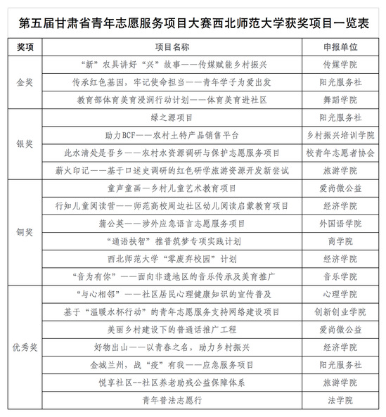 近日,第五届甘肃省青年志愿服务项目大赛组委会公布获奖项目名单,我校斩获金奖3项、银奖4项、铜奖6项、优秀奖7项,获奖总数位列全省第一。