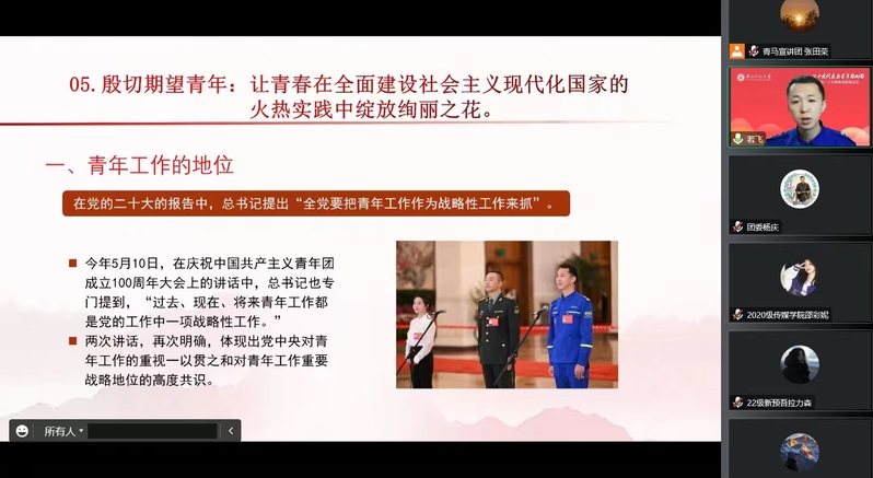 党的二十大召开以来,全校各级团组织统筹线上与线下多种资源,及时深入开展“学习二十大 奋进新征程 永远跟党走”主题团日活动、专题学习报告、校级示范宣讲等特色化、品牌化宣传教育活动,推动学习宣传贯彻党的二十大精神在广大青年中走深走实,在全校范围内不断掀起学习二十大精神新的热潮。