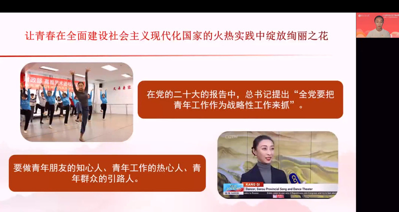 两场宣讲活动中,康琦、於若飞分别作了题为《奋进新时代,将青春舞动在民族复兴的征程中》《让青春在持续奋斗中绽放绚丽之花》的报告。他们通过分享参加此次盛会的所见所闻和所思所想,结合自己投身文艺工作、志愿服务的成长经历和生动实践,从青年视角出发,主题鲜明、深入浅出地对党的二十大报告做了系统全面的讲解和阐释,带领全体师生进一步对党的二十大精神实质和核心要义深化理解和领悟,引导广大团员青年永远听党话、跟党走,为实现第二个百年奋斗目标汇聚青春智慧和力量。