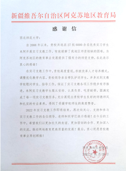 信中指出,自2008年以来,我校共选派27批6000余名优秀实习学生赴阿克苏地区开展实习支教工作,有效缓解了阿克苏地区师资短缺的困难,为当地教育事业发展提供了强有力的师资支持,表示衷心的感谢。
