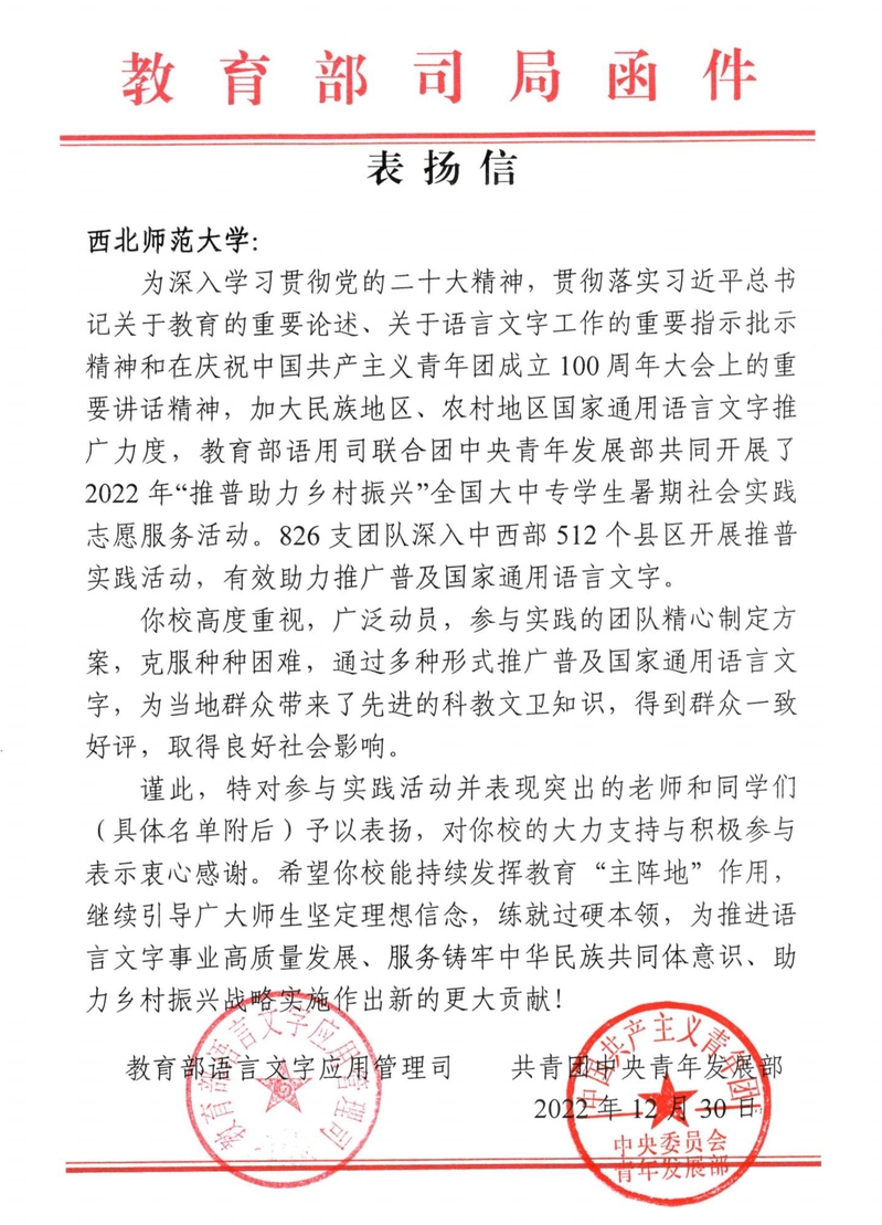 2022年,校团委、日韩人妻无码一区二区三区久久99_日韩精品一区二区三区中文在线_无码日韩精品一区二区免费_久久久91精品国产一区二区三区_亚洲精品久久久一区黄无码_国产91精品一区二区麻豆网站_成人国内精品久久久久影院语言文字推广基地组织5支推普专项实践团与全国821支团队深入中西部512个县区开展推普实践活动。旅游学院推普助力乡村振兴实践团深入甘南藏族自治州卓尼县组织开展“一字一语普通话 千言万语汇中华”推广普通话主题宣讲、“童音同语 学前说好普通话”主题活动、“甘肃党的青年运动史理论宣讲”等实践活动,并整理撰写藏汉双语版《甘肃党的青年运动史》讲解资料,有效助力推广普及国家通用语言文字。