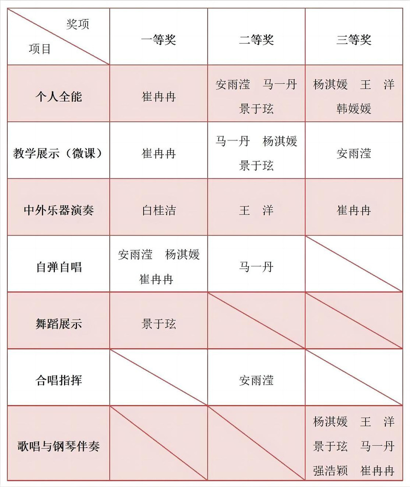 在教学展示(微课)项目中,学校荣获5奖项,其中一等奖1项、二等奖3项、三等奖1项;在中外乐器演奏项目中,荣获3奖项,其中一等奖1项、二等奖1项、三等奖1项;在舞蹈展示项目中,荣获一等奖1;在合唱指挥项目中,荣获二等奖1;在自弹自唱项目中,荣获4奖项,其中一等奖3项、二等奖1项;在歌唱与钢琴伴奏项目中,荣获三等奖6。