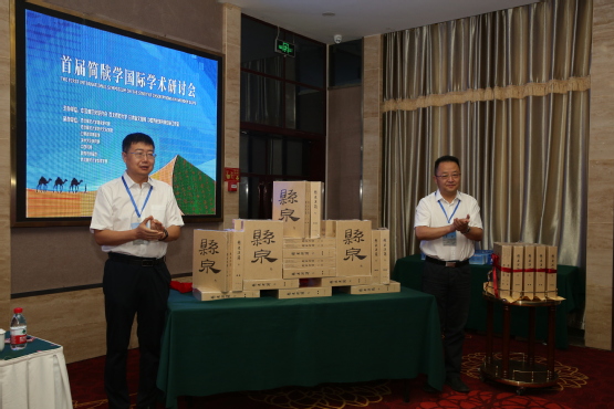 首发式后,贾宁、程亮、张德芳、朱建军、侯旭东、秦志华共同为韩国木简学会、香港中文大学图书馆、敦煌市博物馆、瓜州县博物馆、凉州文化研究院、敦煌阳关博物馆等单位和参加“首届简牍学国际学术论坛”的专家学者赠送新书。