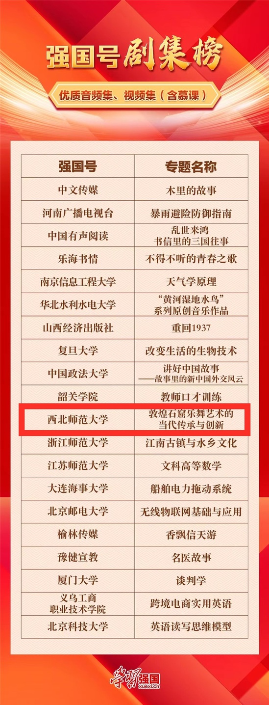 近日,“学习强国”官方平台发布了学习强国号“耕耘榜”“热度榜”“人气榜”“创意榜”“剧集榜”五大榜单,全国范围内共100家强国号上榜。其中,由西北师大“学习强国”号推出的《敦煌石窟乐舞艺术的当代传承与创新》系列剧集荣登五大榜单中的“剧集榜”。