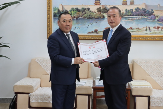 王占仁对吉方高校领导的到访表示欢迎,从办学历史、学科建设、发展现状等方面介绍学校办学情况。他表示,近年来,学校积极主动服务国家“一带一路”倡议,与中亚国家高校的合作广泛深入。学校成立了中亚研究院、吉尔吉斯斯坦研究中心,与吉尔吉斯斯坦国立大学共建吉中“一带一路”研究中心,连续举办“中华语言文化本科学历班”中亚留学生项目,与中亚高校届次化联合举办 “中国与中亚人文交流与合作国际论坛”,组织翻译中亚五国常用法律,与吉尔吉斯斯坦多所高校建立了长期良好的伙伴关系,在学生培养、教师互访、学术和科研合作等方面有坚实的合作基础。会上,王占仁还为化学化工学院特聘教授乌森诺夫·科尼什别克先生、国际文化交流学院特聘教授科兹耶夫·杜鲁斯先生颁发了特聘教授聘书,希望进一步加强校际友好交流,为教育、文化、学科领域贡献更多力量。