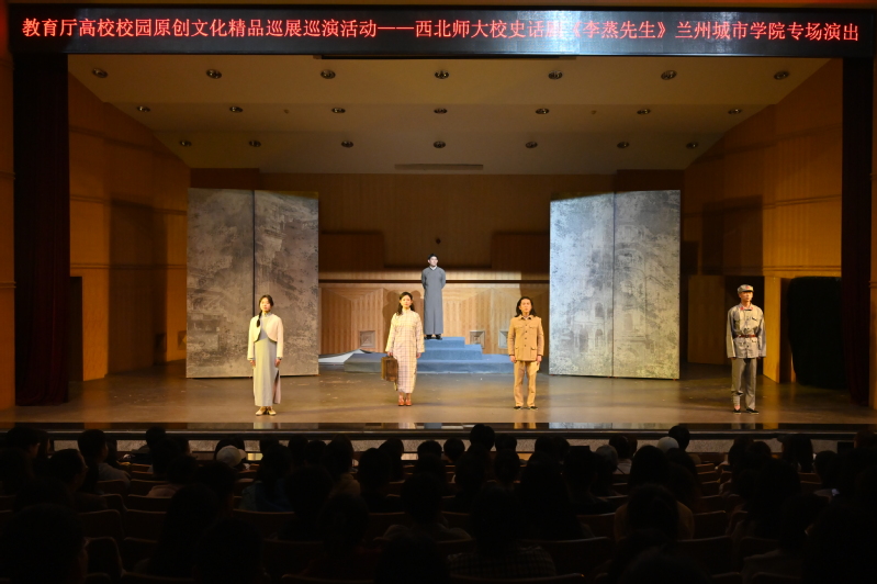 在五四青年节来临之际,西北师大原创校史话剧《李蒸先生》走进兰州城市学院、兰州工业学院进行专场演出,兰州城市学院党委副书记牟录贵,兰州工业学院党委委员、统战部部长张红岩出席活动并致词,西北师大团委负责人参加活动,两所高校师生代表共1200余人现场观看了演出。