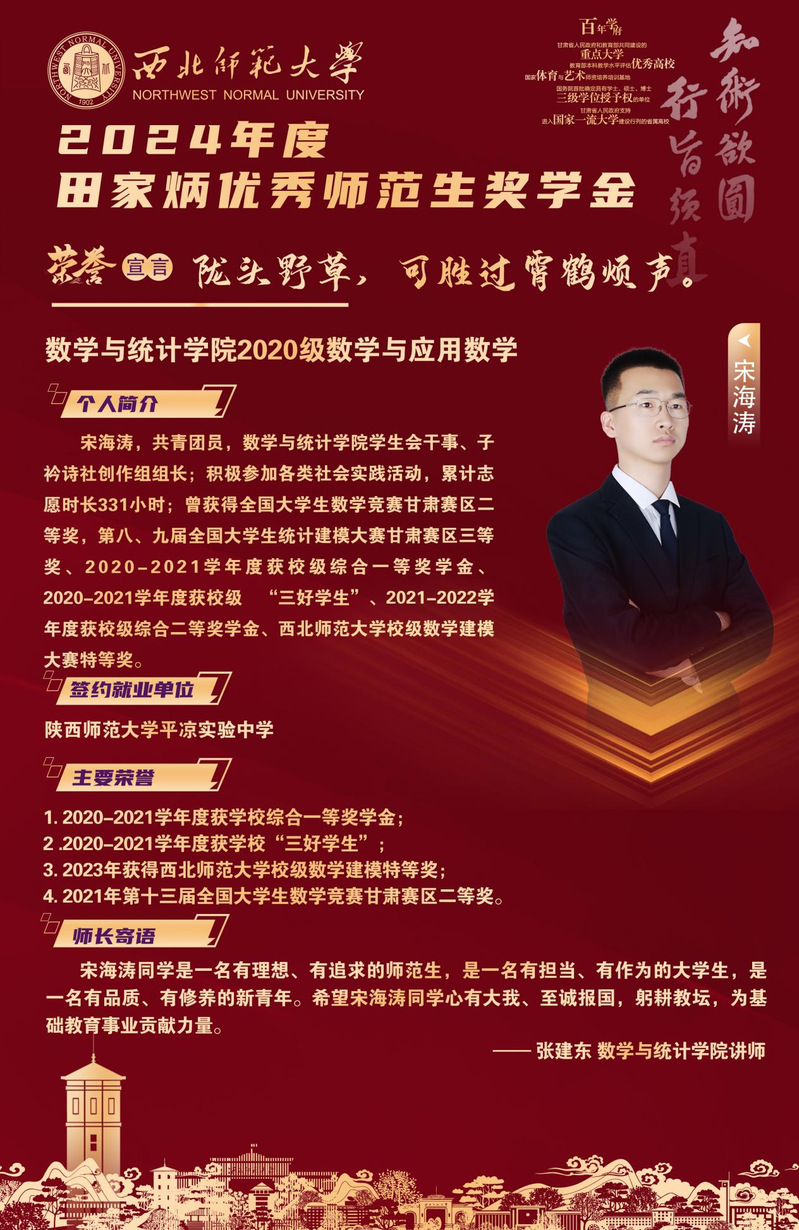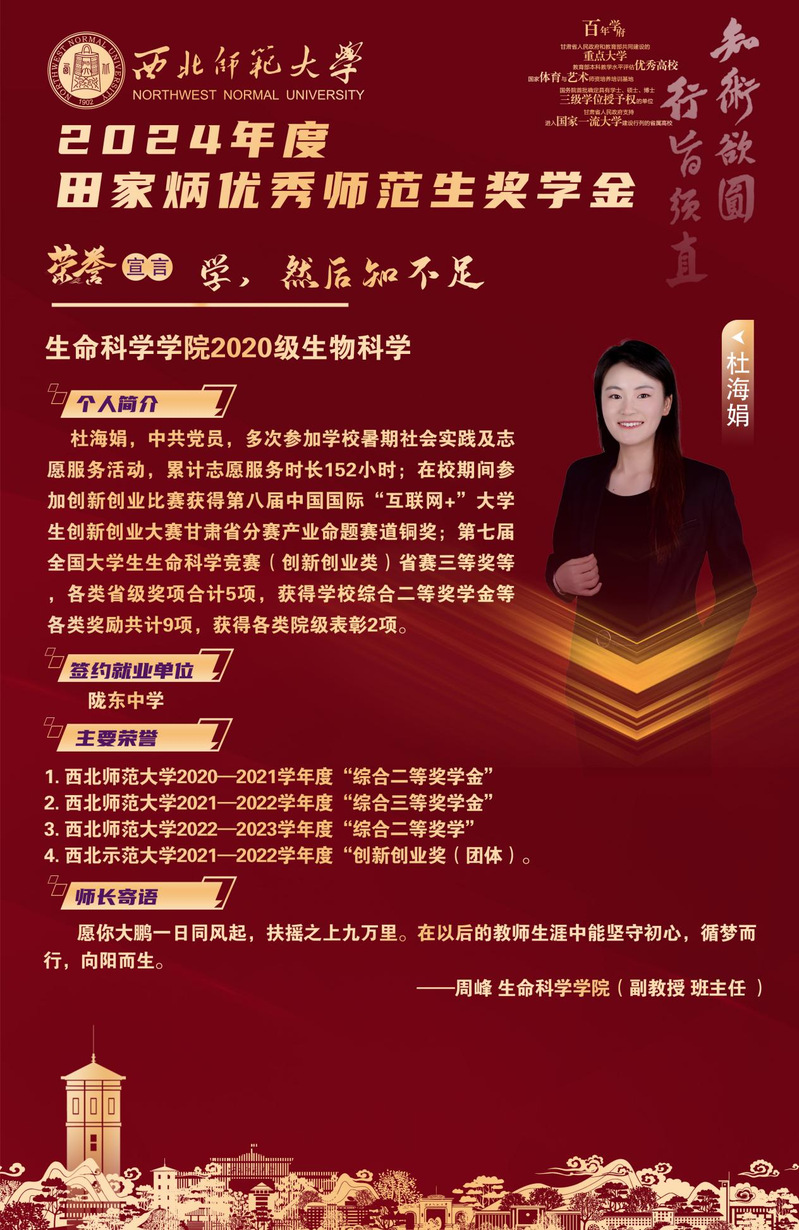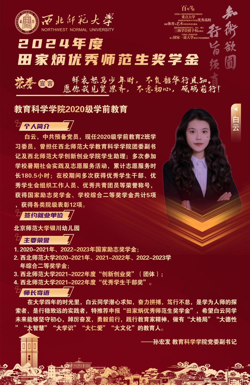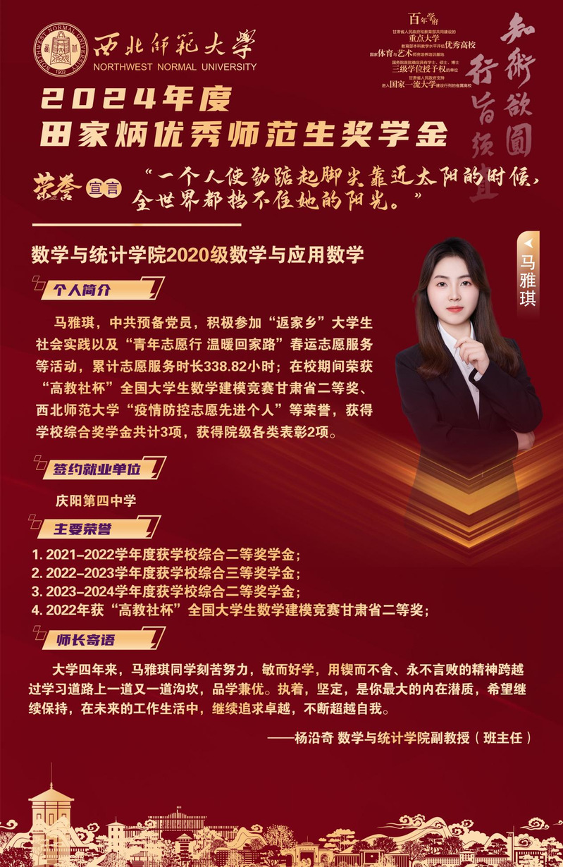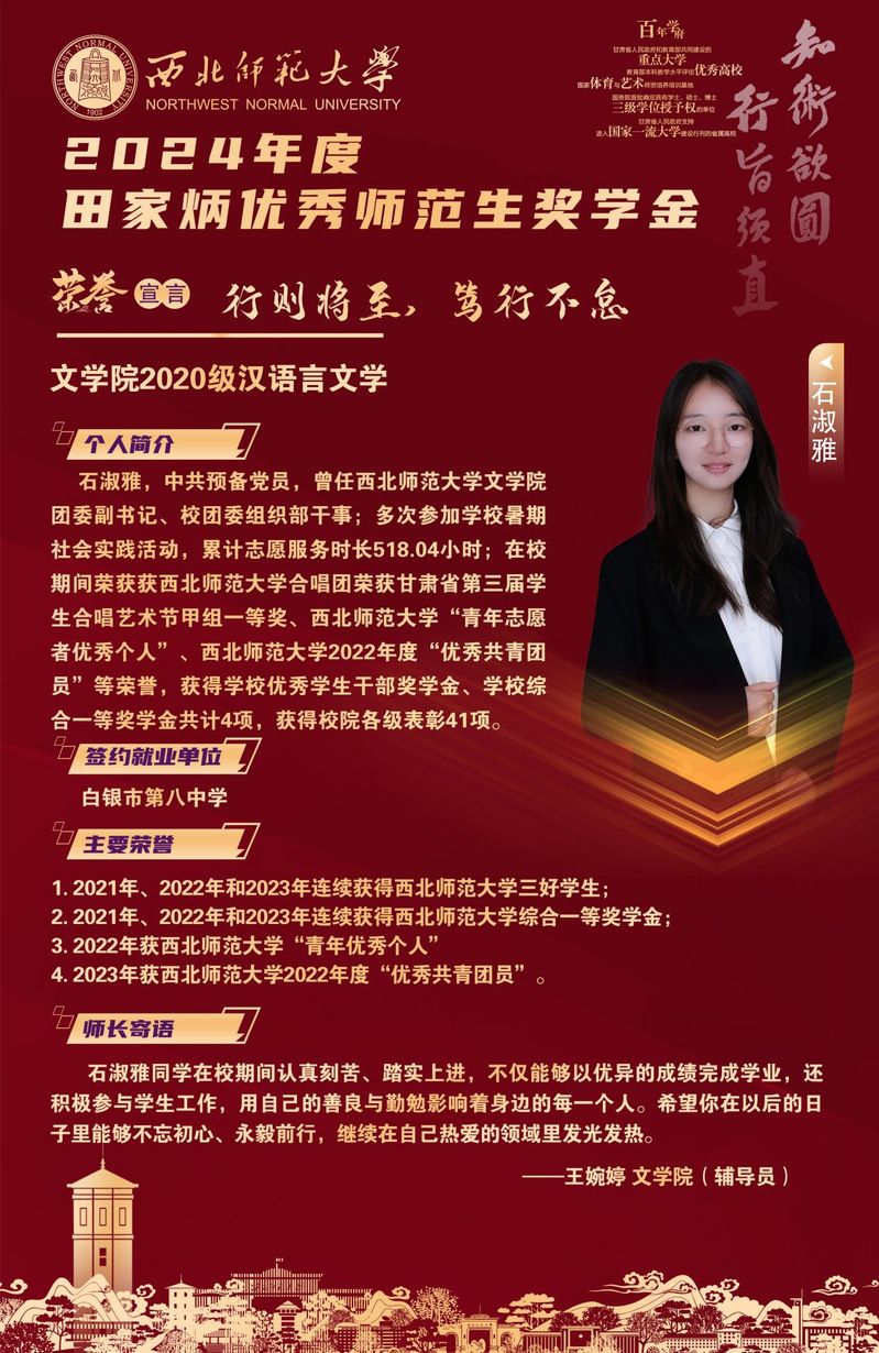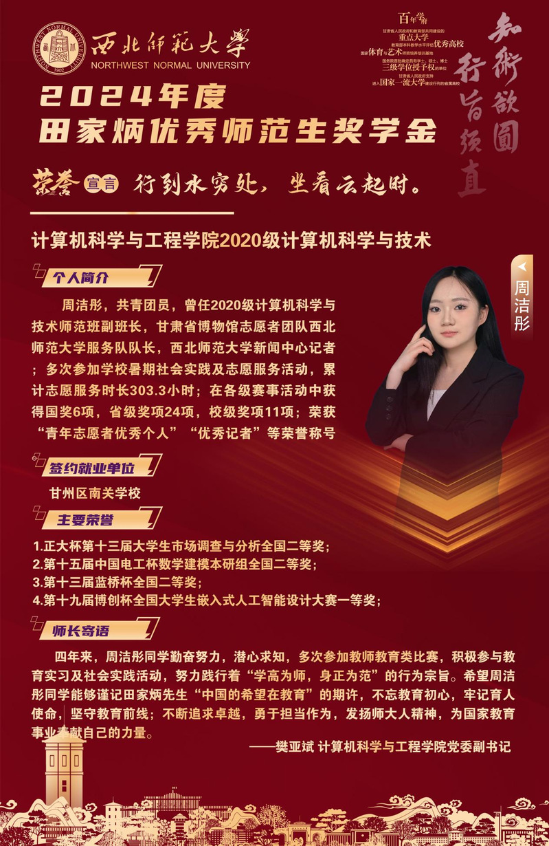 为树立“躬耕教坛 强国有我”的西北师大毕业生榜样,“田家炳优秀师范生奖学金”将荣誉赋予奔赴基层教育岗位的优秀毕业生,激励他们不断砥砺青春,续写华章。自本年度“田家炳优秀师范生奖学金”评选工作启动以来,经各学院推荐和资格审核,来自16个学院的48位优秀毕业生成为推荐候选人。其中参评一等奖、二等奖并进入最终答辩评审的22位优秀学子,他们敢于挑战,在科研领域勇攀高峰;他们无私奉献,用心用情服务师生;他们青春洋溢,在志愿活动中澎湃活力;他们脚踏实地,在扎根中国大地的教育使命中上下求索……