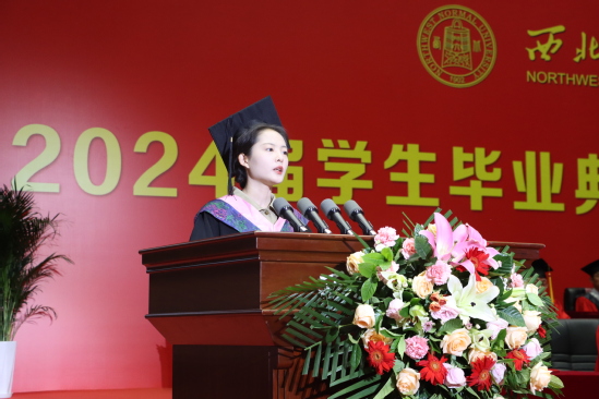 2024届本科毕业生代表、教育科学学院2020级教育学专业白燕在发言中表示,四年来,我们被西师精神、西师情怀和西师行动所滋养,见证了百廿师大事业的蒸蒸日上,见证了师大学子在不同领域中发光发热,见证了各学科向上向好的发展态势。在未来的日子里,我们每一位师大学子都将以更加饱满的热情和更加坚定的信念,为实现自己的人生目标而努力奋斗,为母校增光添彩而奋斗。