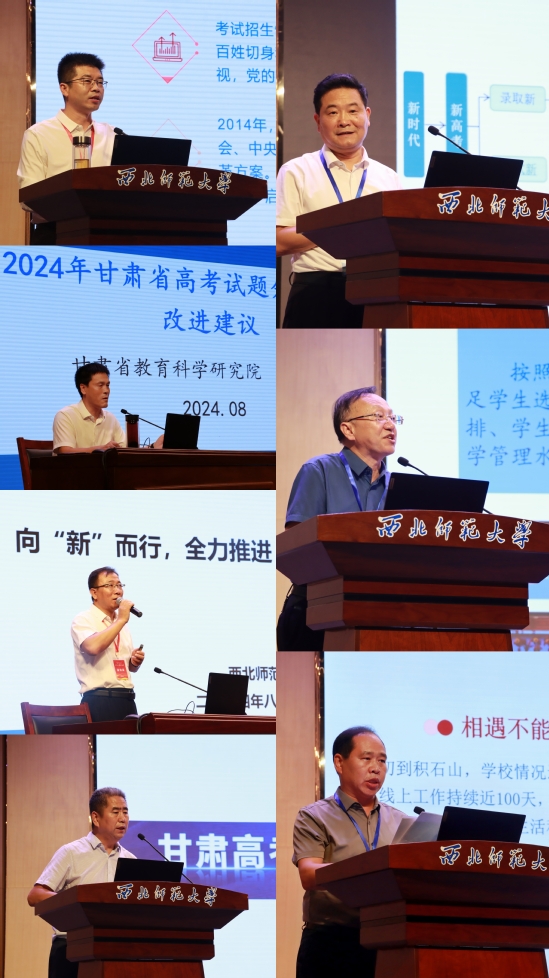 省教育考试院普招处处长高辉,省教育科学研究院党委书记、院长赵洪涛,学校教务处处长、招生考试办公室主任、教师教育学院院长杨纳名分别作了《我省高考综合改革的推进、成效及展望》《2024年甘肃省高考试题分析与教学改进建议》《向“新”而行,全力推进“新”质师范教育建设》报告。西北师大附中校长周爱祖、陇南一中党委书记许邦兴、平凉一中校长李生强、临夏积石中学校长董洪海结合高考实战,作了新高考背景下高中教育教学优秀实践经验分享。省内各市州教育局领导和全省示范性高中校长在分组研讨中紧紧围绕大会主题做了深入的研讨。