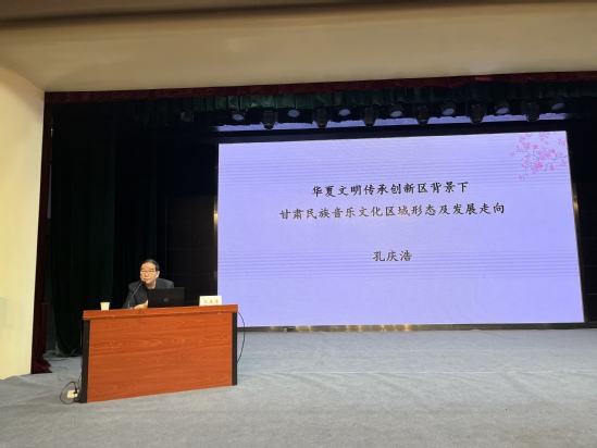孔庆浩以《华夏文明传承创新区背景下甘肃民族音乐文化区域形态及发展走向》为题,从“甘肃省区域音乐文化的基本特点”“甘肃民族民间音乐的发展现状”“甘肃各地民族音乐的传承与创新”等几个方面讲述了甘肃传统音乐的魅力与价值,引导学生通过学习和创新丰富和发展甘肃省传统民族民间音乐,进一步弘扬中华美育精神,坚定文化自信。