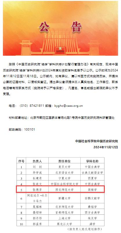 11月12日,中国历史研究院公布了2024年度“绝学”学科扶持计划资助学科名单,西北师“简牍学”学科入选。