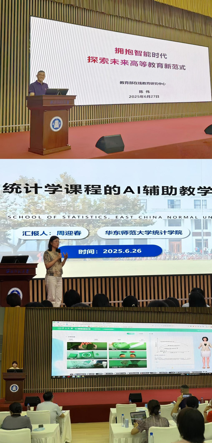 会上,教育部在线教育研究中心交流联络部主任陈伟、华东师范大学统计学院副院长周迎春、学堂在线高级AI课程讲师李亚臻分别以“拥抱智能时代 探索未来高等教育新范式”“统计学课程的AI辅助教学实践与思考”“基于雨课堂AI平台课程建设实操演示”为题作了报告。与会教师围绕智慧教学模式的创新与应用等话题进行了讨论与交流。