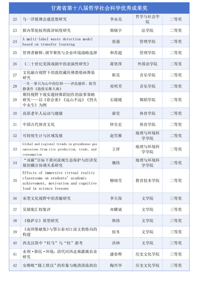 甘肃省哲学社会科学优秀成果奖和敦煌文艺奖是全省哲学社会科学和文艺领域的最高奖项。本届共评出哲学社会科学优秀成果奖300项、敦煌文艺奖90项。近年来,学校哲学社会科学研究紧密围绕国家战略和区域发展需求,系统推进有组织科研,在“大平台、大团队、大项目、大成果”建设方面建设成效显著,今后,学校将继续锚定“双一流”建设目标,强化有组织科研,推动学科交叉融合,持续推进哲学社会科学学科体系、学术体系、话语体系发展与创新,努力打造更多扎根西部的学术精品和文艺力作。